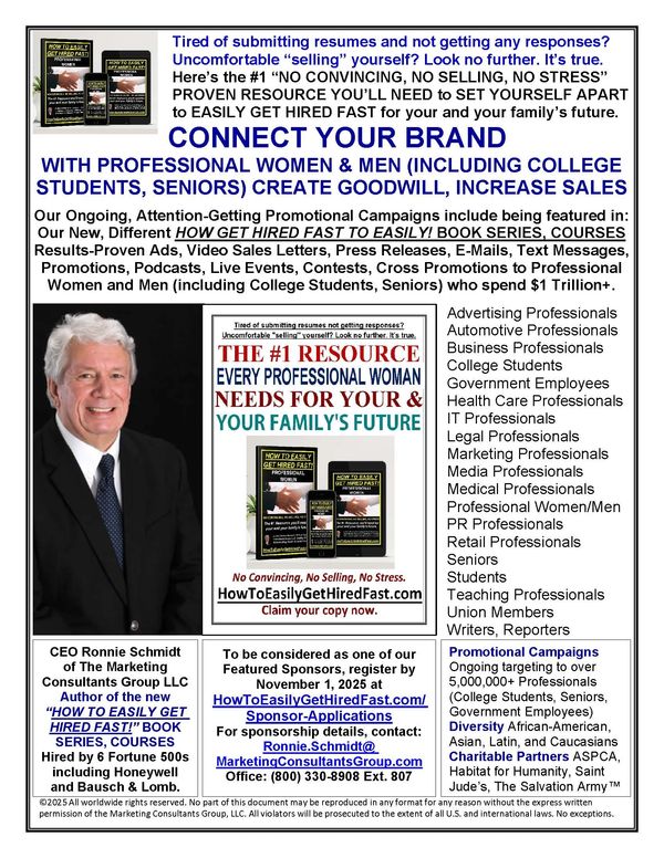 With all the ongoing exposure your brand will get with millions of potential consumers in our HOW TO EASILY GET HIRED FAST! Advanced Teaching Book Series Marketing Campaigns to increase your reach, generate enormous goodwill and grow your sales, it makes perfect sense to make a commitment and an investment and become one of our Featured Sponsors.